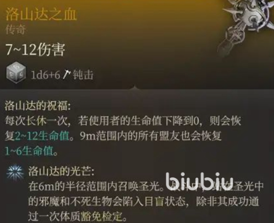 洛山达之血:经过任务获得的硬头锤,佩戴就可以得到洛山达的祝福,在长休的时候,要是操作者的生命值低到了0,还会恢复2-12点的生命值,并且9m范围内的友方也会获得一半的恢复效果。同时也可以得到附魔+3的状态,使用6环塑能法术。