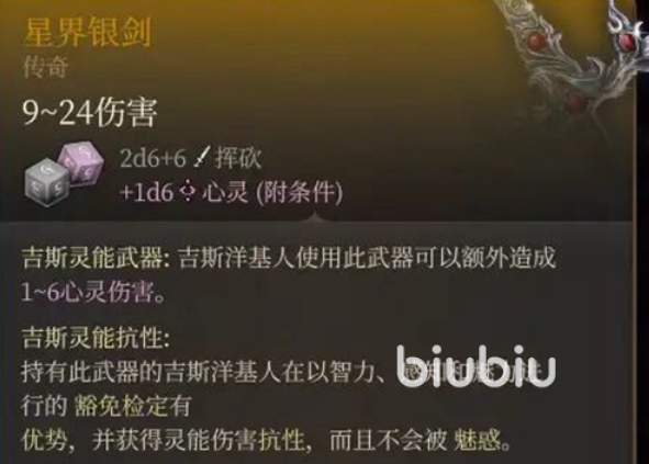 星界银剑:这是一把双手巨剑,带有吉斯灵能,当吉斯洋基人使用它的时候,会有额外的1-6点的心灵伤害,并且在进行智力、感知以及魅力的豁免鉴定时,会更有优势,不但不会被魅惑,还会拥有灵能伤害的抗性。同时武器附魔状态会+3,并且可以解锁4个熟练项。