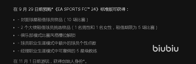 本作在2023年的9月29前购买都算作预购,在此前购买的玩家可获得额外奖励,其中包括租借物品以及俱乐部风格槽以及球员个性点数和五星教练,此外在11月1日前游玩你还可以获得创始人身份,随着发售日期的越来越近想拿奖励的话就得快点购入了哦。