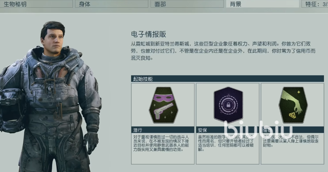 现版本中,首屈一指的背景自然是电子情报商,这个背景带有潜行、安保和偷窃三个技能。潜行就是在不被人察觉的情况下进行移动,而安保是拥有强大的开锁技术,偷窃则是不被人发现的情况下窃取到想要的东西,这三个技能的结合,让我们前期的资源会非常容易获取到。有了资源,那我们行走在宇宙中只会更加容易,所以目前最强的背景就是这个了。
