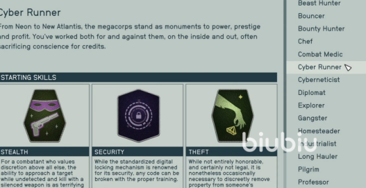 首先给大家介绍的隐狙流是以电子情报贩背景来解读的。我们先来看看是初始技能,潜行、安保以及偷窃。潜行是物理系的技能。这个技能不仅提升了玩家在潜行中被发现的几率,还提升了装备的潜行伤害。不过,随着玩家的等级越来越高,潜行的伤害也越来越高,当玩家的潜行达到4级的时候,开门就不会惊扰到敌人了。而安保技能则是可以让玩家的开锁变得更简单,安保技能的等级越高,就越有可能开启更高级别的门锁,当安保技能升到4级时,就可以储存五次自动尝试次数。偷窃这个技能可以让玩家开启扒窃目标的能力,而且解锁的几率会随着等级的提升而提升。