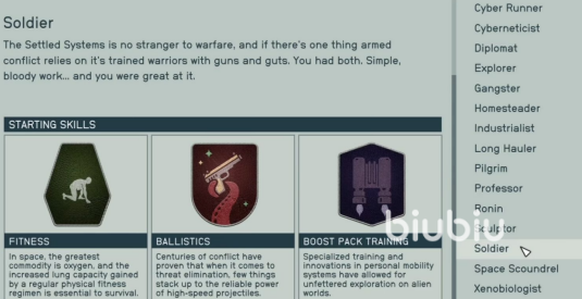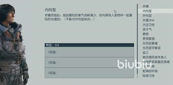 然后再来说说特征,首选内向型、陆地习性和悬赏。在社交技能中,可以选择商贸、拾荒、偷窃、协商、独行侠。而科学技能,你可以选择医疗、研究方法、武器工程学。对于技术技能,可以选择飞行背包训练、驾驶、安保、引擎系统、护盾系统。