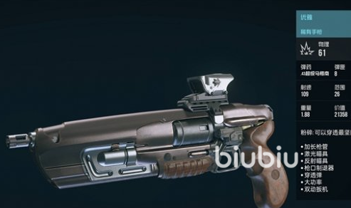 第四把推荐优雅,这是一把比较基础的手枪,但是获取起来很容易,在前期还是挺好使的。这把枪的各方面属性都比较均衡,伤害、精度以及射速都还行。前期如果没有好的半自动武器,这把枪绝对是最好的选择。