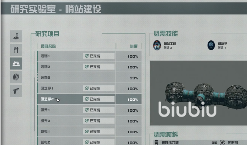 在游戏中,我们需要点出园艺学、驯养、植物学和动物学这几个技能。其中前者是在研究项目中的项目,而后者则是科学中的技能。如果小伙伴们在游戏中无法制造,可能是因为少了一个非常重要的细节,那就是必须先找到一个有动物和植物生存的星球,完成到底动植物的勘测。