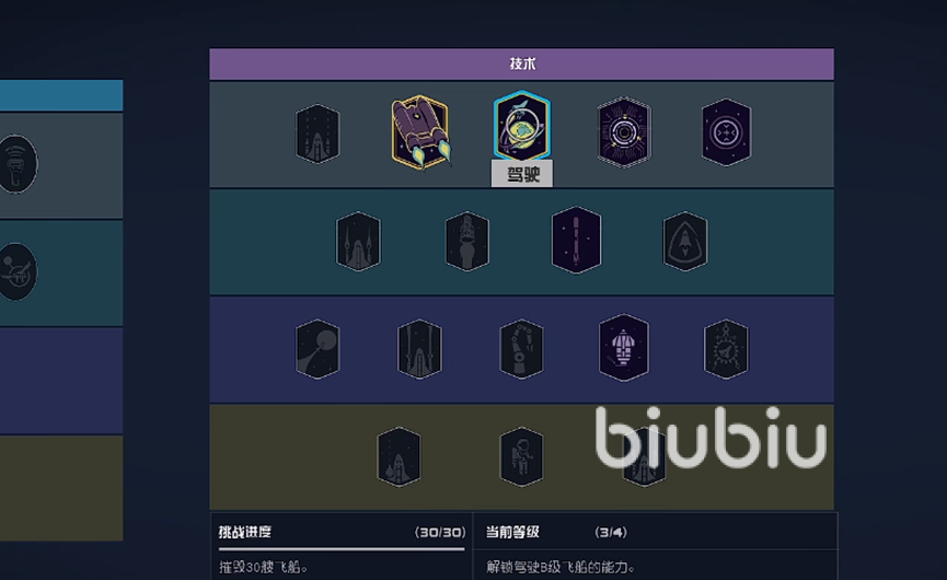 在游戏中我们点击技术,可以看到每升一级需要完成的任务,比如解锁2级的驾驶,需要摧毁15架飞船。3级则需要摧毁30架。玩家们可以根据游戏中的提示去进行解锁。