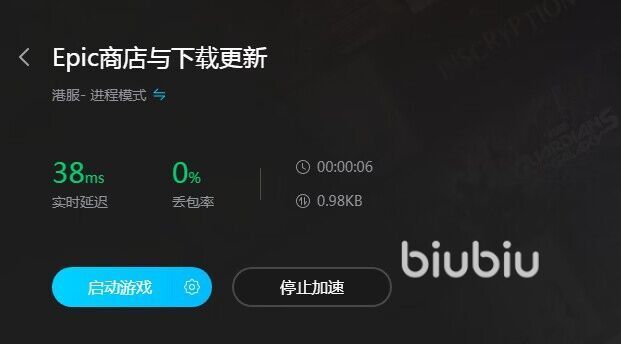 使用方法也非常简单,安装好biubiu之后在搜索栏中查询并找到Epic的相关服务,点击使用选择节点进行优化,再重启一下Epic Store就可以发现无论是载入页面还是下载更新游戏的延迟问题都得到了解决。