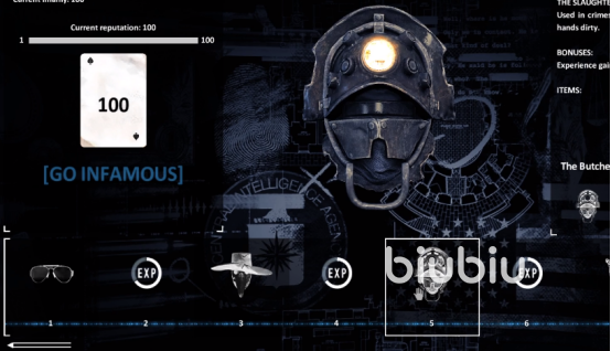 目前恶名奖励一共有100个等级,玩家们可以左右滑动了解对应的奖励内容。前期一般都是经验获取量增加百分数(5%-7.5%不等)和各种面具,比如第7级的时候,就是一个专家面具和经验获取量+5%,并且越往后给的面具稀有度也越高。