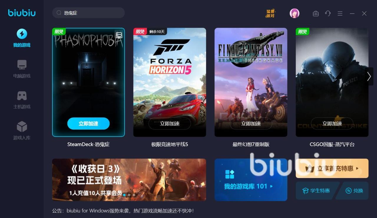 正是这种特别的游戏性质,让很多玩家选择联网去体验,但在联机探索期间,有些用户反馈,经常无法启动联机模式。发生这种情况,很有可能是网络不稳定引起的,用户可以使用biubiu加速器,去对自用的网络进行优化处理,当网络波动变小了,再去玩联机模式。具体的操作方法也不难,玩家打开软件后,搜索到恐鬼症的加速入口,并点击图标上面的立即加速后,加速服务就开始了。为了回馈用户,平台推出了新用户注册免费使用加速3天的福利。