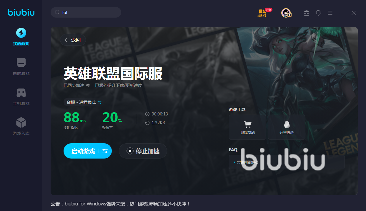 想要进行这样的操作,其实不用自己有太多的经验,只要下载好biubiu之后直接在这里搜索游戏,其他方面操作都有软件在后台自动完成。只需要选中并且打开加速,就可以直接在这里登录,使用起来很方便。在切换台服方面,大家搜索时候没有直接找到,可以先选择国际服从中添加到列表中之后再点击上方的功能选项,从中就可以看到所有国际服里所包含的地区服务器,从中找到台服以后,点击就能切换。整个过程非常快速,不会出现额外卡顿情况,切换过来以后再登录就能实现直接跨服,其他国家或地区服务器,也能以类似方式解决。另外在登录之前可以查看一下界面中所展现出来的数据,尤其是延迟等关系到登陆之后的流畅度情况,在看到数值处于正常区间之内,就可以放心使用了。