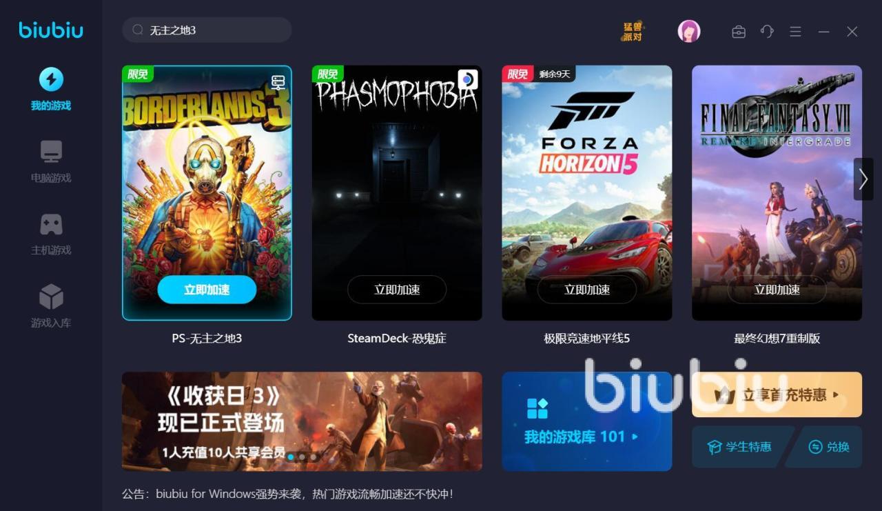 无主之地3不仅能单独去玩,还可以组队联机,在线上一起玩,其中原地复活的机制,让大家可以无脑地向前猛冲,感受激烈有趣的战斗。当在线人数过多时,游戏难免会发生一些卡顿或掉帧,这时候,要是有一个可靠的网络,就不会影响组团打斗了。使用了biubiu加速器,可以有效降低延迟,并且软件很容易上手,用户只要打开应用,找到无主之地3的加速入口,接着点击立即加速就行了。现在下载体验,还会享受新用户注册免费使用加速3天的福利。
