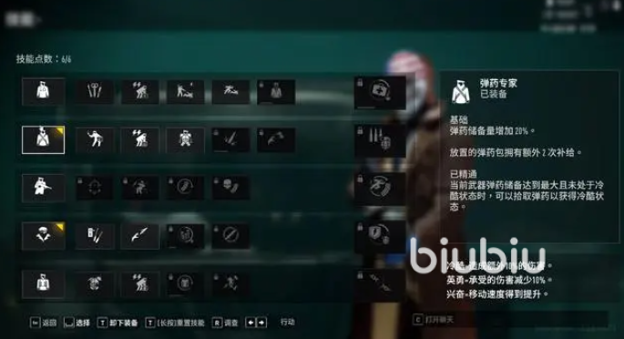 首先是弹药专家分支这块,1级的弹药专家:而这个加点目的就是简单粗暴的备弹上限技能,点了这个,在强突的时候不用担心没有弹药。