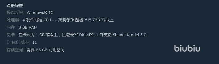 而CPU方面六代i5至少是需要的,虽说起源2引擎的效果并不算顶尖,但想要更好的表现出应有的画质水平,至少处理器算力也不能太拉胯,另外内存上8GB以上,现在也是标配不说了,硬盘空间也要来个85GB以上,并且最好在固态上。