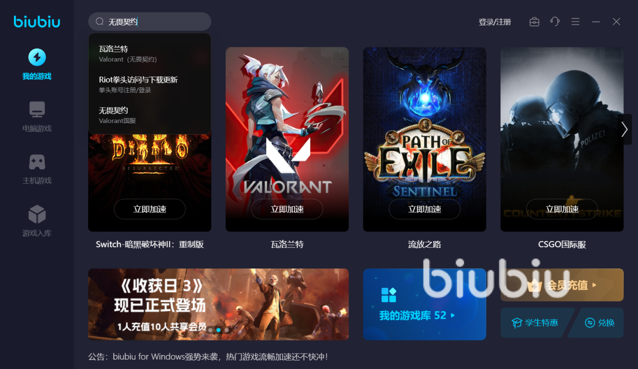 为了给无畏契约加速,大家首先要安装好biubiu,推荐通过官方渠道下载,不要随意信赖第三方平台,以免中毒。