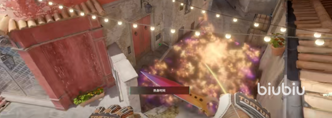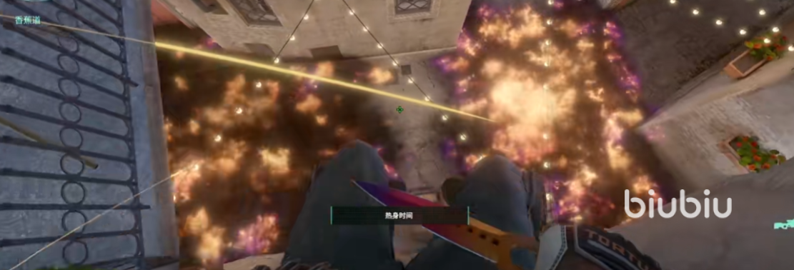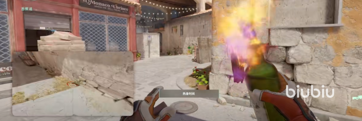 然后第二个人过来,贴着这个柱子,在这个柱子凸起的地方贴住,然后瞄准这个方块的中间就行。而且这颗火是有很大概率烧满两边的。所以一颗近点火,一颗中段火。香蕉道整个就是一个炼狱小镇。几乎没有位置能站着,基本上整个香蕉道就可以直接控制住。