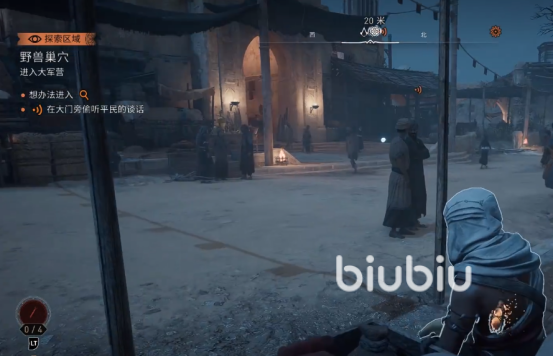首先需要在大门旁偷听路人的谈话,从他们的口中,我们了解到军营到处都是卫兵,貌似只有北边护墙附近有进入的小道。于是,我们需要前往北边,从食物储藏区附近进入军营内部。在进入的时候,要记得收集路上的橙色图标信息,能帮助我们更好的完成任务。我们找到总管,他表示会带我们从侧门进入,但是需要和他保持一段距离,别让人发现我们的关系。