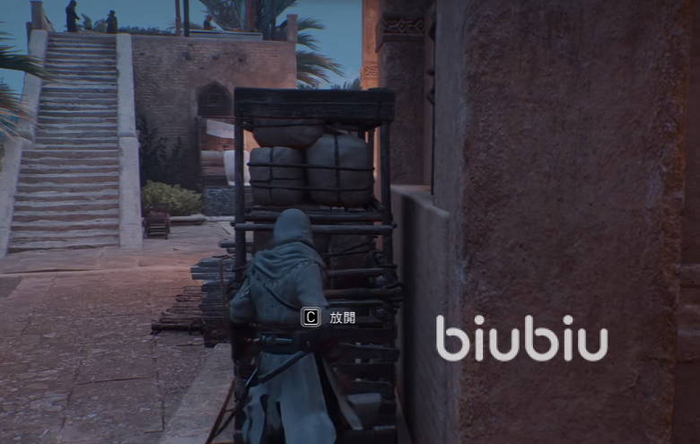 3、转头找到俯瞰点,跳下去在草垛变找到坐在长椅上的人可以得到。