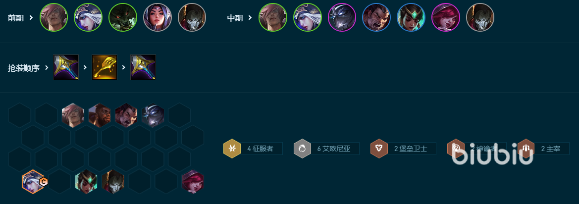 第六个阵容:【艾欧寒冰】6艾欧尼亚4征服者2主宰