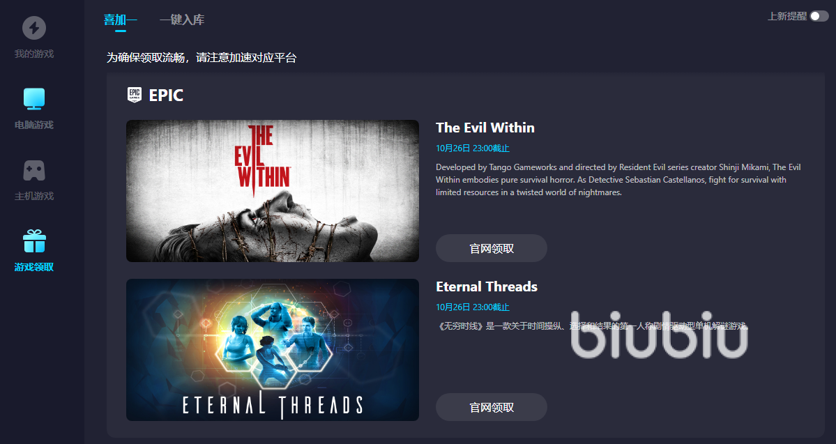 具体的领取方法,大家可以前往biubiu加速器的客户端,点击左边的栏目的最下方【游戏领取】,进入之后,就可以直接看到Epic的喜加一,届时官方领取就能跳转获得限时免费游戏。