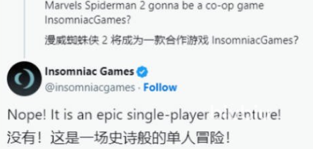 可是随后游戏开发公司Insomniac就在社交媒体上进行了否定的回应,明确表示这是一场史诗般的单人历险。这一回应也让很多期待双人联机的玩家感到失望,毕竟拥有双主角的游戏不能双人,感觉游戏乐趣丧失了很多。
