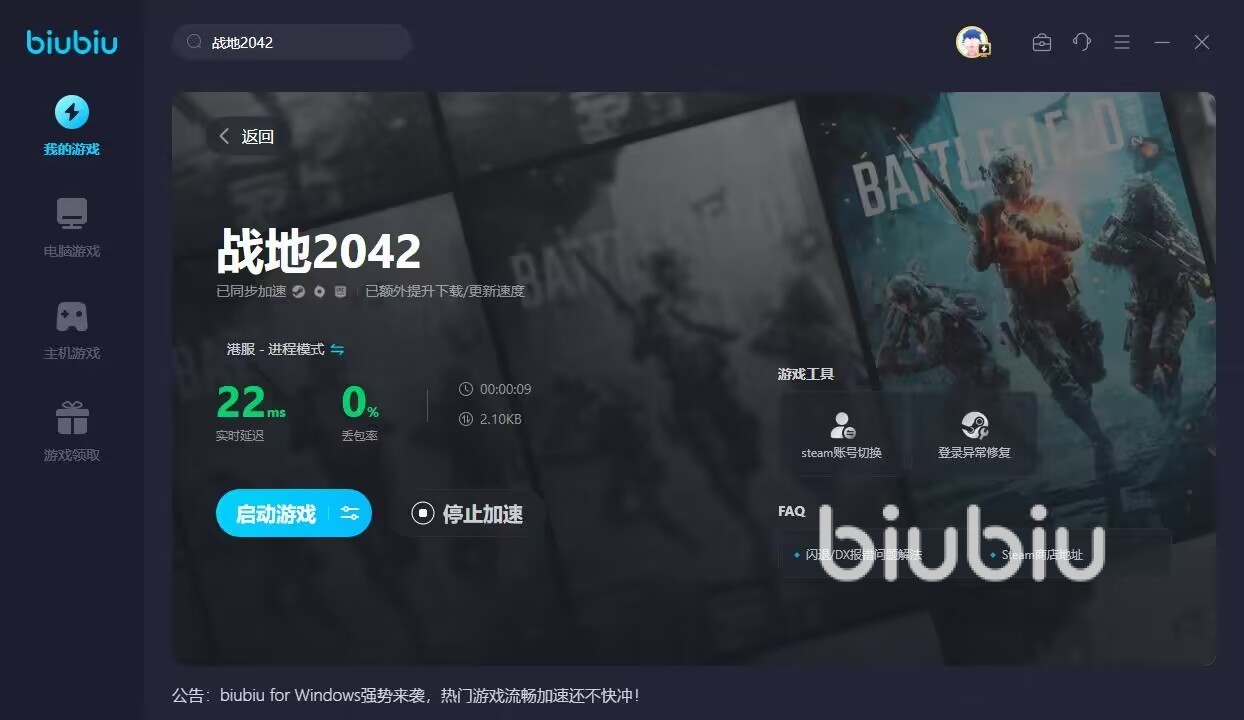 第一点可以去核对下自己的硬件有没有达到相应的配置要求,要是都没问题就能确定是网的问题了。那么便可以着手开始解决了。最简单的方式就是重启路由器或者重置宽带连接,还不起作用那就要找帮手了。毕竟这是个外服游戏,没有稳定的网络节点就会出现各种卡顿问题,用biubiu加速器解决就是个好办法。