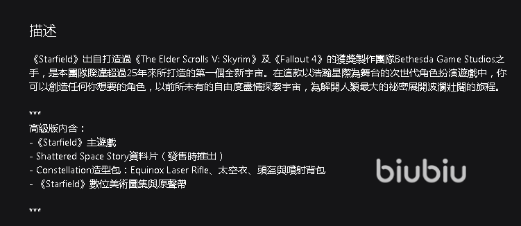 这个版本即这里描述的高级版,有着美术与音乐数字专辑,以及一套外观以及一个DLC资料片,目前制作人陶德·霍华德已经确认该作DLC将在2024年宣布推出,目前的话只能玩玩本体内容。