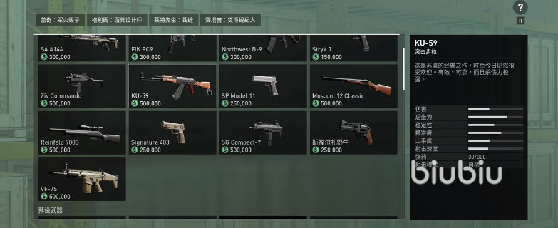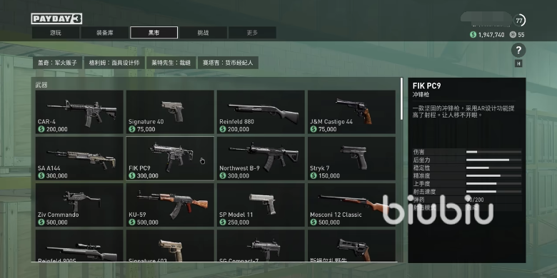 玩家在每局抢到手里的钱都会计算到你的资产里,可以在界面中的黑市中买枪,这也是游戏中唯一的交易元素,本作虽然是网游但不会有拍卖行那种玩家间的交易,你可以在黑市里选购枪械并将它装备在自己身上。在这里冲锋枪突击步枪以及手枪都有卖,你可以通过比对了解它们的性能,另外也可以在详情中查询它们的外观模型。
