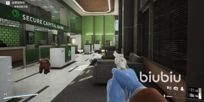 玩家在战斗的时候也可以不能更换未装备的武器,所以你需要根据自己的战斗风格,提前装备好自己的武器和投掷品。无论你喜欢什么样的武器,都只能用来和警察来战斗,如果随意击杀平民的话会减收益,毕竟随便开枪也就变成屠杀了,不叫抢劫了,在难度和游戏性上也会体验大打折扣。