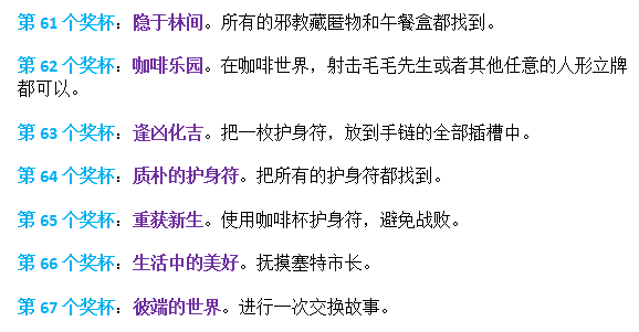 第64个以及65个奖杯是相关联的。一个是需要把所有的护身符都找到,紧接着需要使用一次咖啡杯护身符,避免战败。最后两个奖杯算是对游戏剧情的一个总结。随着结局落地,成就自然也就完成了。