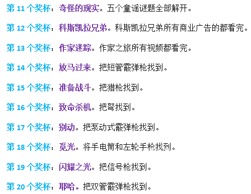 第11个到第13个奖杯全都是看游戏中的视频,也是属于无脑操作了,只要点开相应视频等着播放完成就好了,细心一些记得要把每一类视频全都看完才可以哦。第14个到第20个奖杯则全部是寻找到游戏中的各项武器,每寻找到一种都能够顺带完成一项成就。