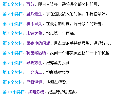 首先我们要知道游戏中的奖杯数量共计有67个,乍一看是比较多的,但是整体完成条件都不是很难。首先其中第1个到第10个基本在任务过程中就能够顺便完成。比如第1个即白金奖杯,也就是总奖杯。另外第2个到第10个奖杯则是运用任务过程中的工具进行相应操作即可,游戏进度中也会有提示。