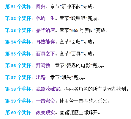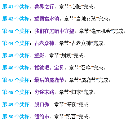 第38个至第57个奖杯其实全部都是章节故事的完结奖励,不过根据游玩的进度,每个人选择的故事导向可能会不一样,所以大家可以在完成单一章节结局以后,放到最后再去逐一补漏完成成就,这样也是最省时间以及最迅速的方法。