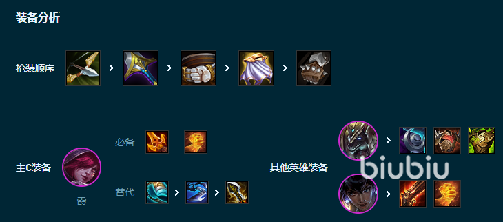 至于装备,霞是主C,给她攻击装备就行,所以带死亡之刃和正义之手。然后给狗头肉装,出个薄暮法袍,而给副C的尼菈带攻速和吸血即可。