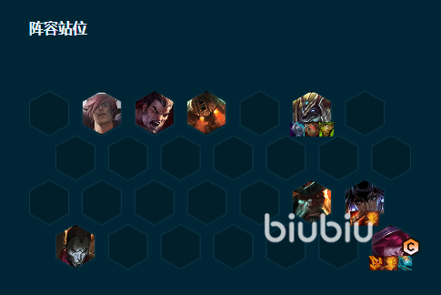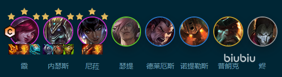 阵容推荐:霞、狗头、尼菈、瑟提、诺手、泰坦、船长和烬。这个阵容是4征服者4主宰和3艾欧尼亚,主C是霞。主宰者都放第一排抗伤害,妮菈和霞放在最后一排,最好放在最肉的狗头后面,烬放另外一边,具体的站位可以参考下图。