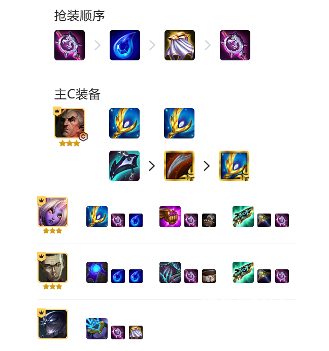 首先阵容介绍:乌鸦、奶妈、老丈人、慎、皇子、宝石、发条,可以组成4法师2堡垒2神谕2司令2巨神峰。这个阵容主C就是乌鸦,与其他法师阵容相比不同的是,这个主C并不需要高费。