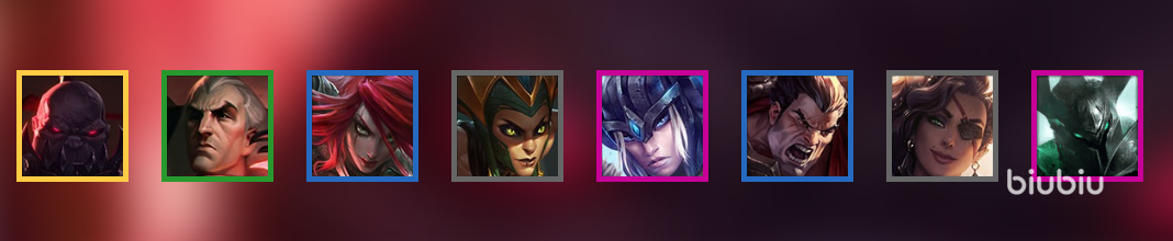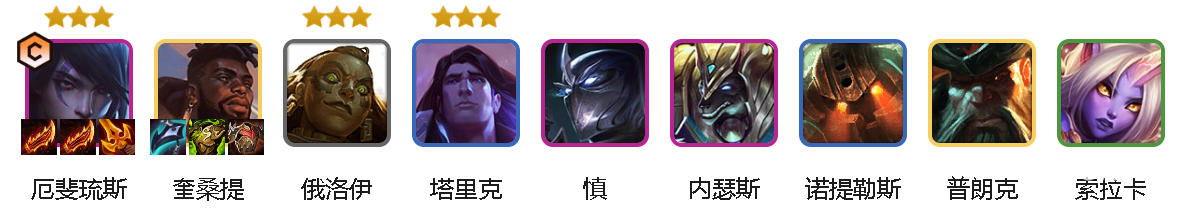 另外你也会点亮主宰格斗家和裁决战士这个几个青铜级天赋,他们会带来吸血以及生命值提上和额外伤害,都是很有用的属性加成,具体的人员构成可以看这张插图。不过通常最后一个棋子需要通过阵营徽章转换成诺克萨斯角色来完成搭配,而并不是用原生阵营英雄来完成你的阵容“拼图”。这一套的登场率在游戏中几乎排倒数,因为很难凑齐,但是登顶率却高达53%。一旦拿到之后几乎就赢了一半,有时运气来了不妨就试试吧。