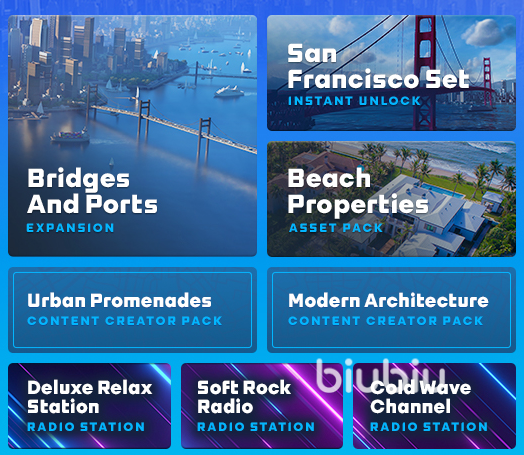此外还会给你上来两个内容创作者包,这会让你在前期就不会吹灰之力拿到很多建造物品,早期的游玩节奏也会变得更快了。Bridges Ports扩展包不光会给你提供更多的物件,还会允许你解锁海洋产业,要想完整的拥有沿海主题内容,可不要错过了。最后还还一个电台音乐包,会为你的游戏带来更丰富的BGM。
