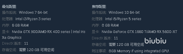 本作最低需要Windows7以上的系统,即便是低画质游玩也需要酷睿i3型号的处理器,显卡方面则是需要GTX900以上,以及6GB的运行内存。另外你还需要DX11以上的版本支持,以及120GB的存储空间,最好是使用固态硬盘来安装。