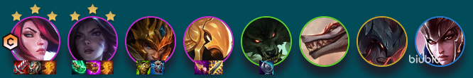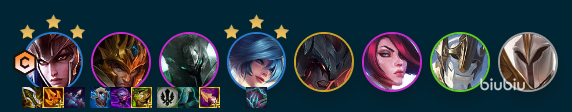 还有个阵容是【挑战剑姬】的阵容,整体是4挑战者3德玛西亚2暗裔。具体阵容剑姬、卡莎、皇子、沙皇、纳亚菲利、狼人、剑魔、奎因。对于这套阵容,剑姬是主C,所以我们最优先给剑姬装备,还有卡莎。剑姬可以带饮血和泰坦,卡莎带法爆、正义之手和朔极之矛,然后再做个薄暮法袍。再有多余装备你可以把肉装给皇子,把输出的装备给沙皇,再有其他的装备,你再给到剑魔。这套阵容和上套阵容对比,这套不怕肉盾,但是比较怕刺客类型的阵容,还怕手长的尼菈阵容。
