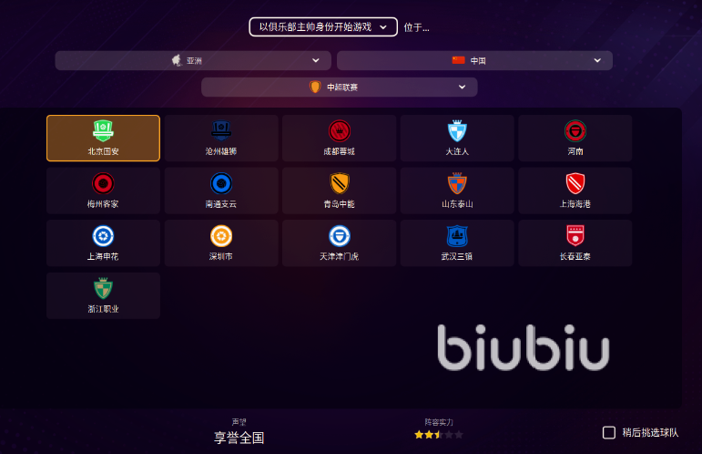 想要有挑战性但也不至于拉胯的过于离谱,像北京国安这种中游队伍可以玩一玩,既有于大宝这种命老将,也有张玉宁等新一代的优秀球员,更衣室氛围本身也不错,不过后卫和门将这块比较弱,需要加强阵容深度。