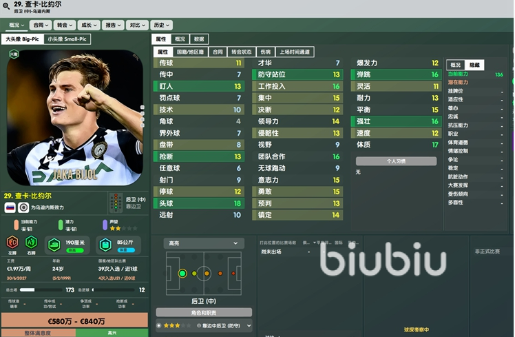 第一位推荐的中后卫叫做查卡比约尔,来自意甲,目前为乌迪内斯效力。这名球员身价仅需650W,对比他的能力可以说是非常便宜了。