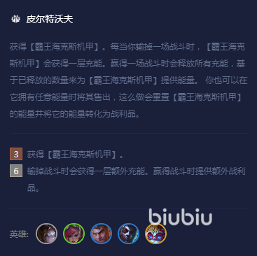 然后就是该玩什么阵容的问题,一般来说,肯定是要玩羁绊最多的那些阵容,比如艾欧尼亚、比尔吉沃特等等。但是其实大多数最想要的还是皮尔特沃夫的纹章了,这是游戏中唯一一个可以走连败的羁绊了。通过不断的输掉对局,获得可以积累的奖励,最后赢一把直接获得超级大奖赢的比赛。