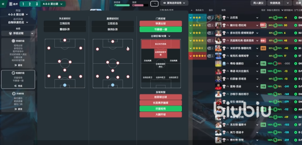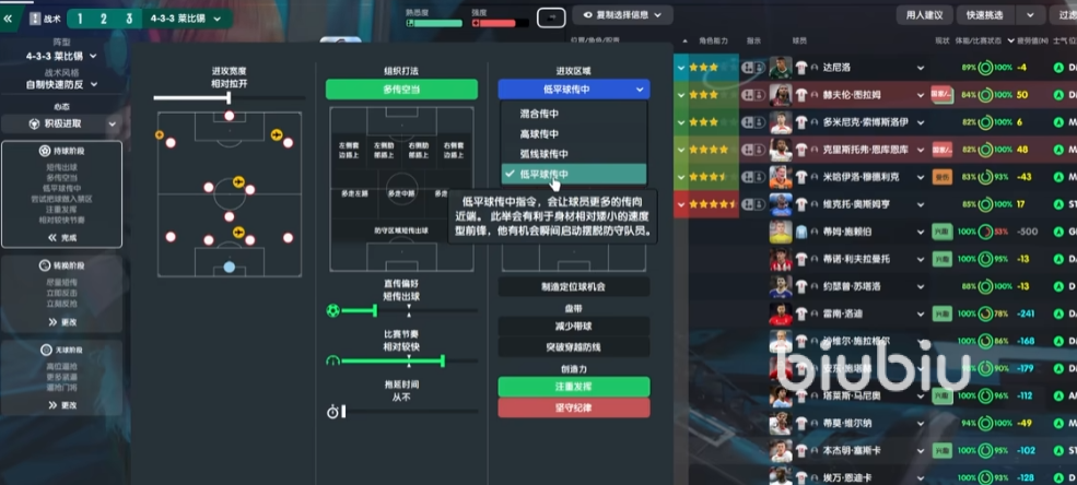 下面尝试把球做入禁区,这个对于强队来说是默认B点的,不然你的球员浪射会特别的多,转化率也会很低。制造定位球机会这个,如果你的定位球特别理想的话可以点上,但是感觉它会降低你球员在反击中的节奏,所以一般情况下初始默认化不太会去点。