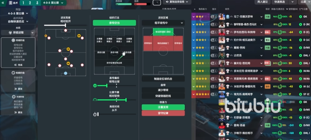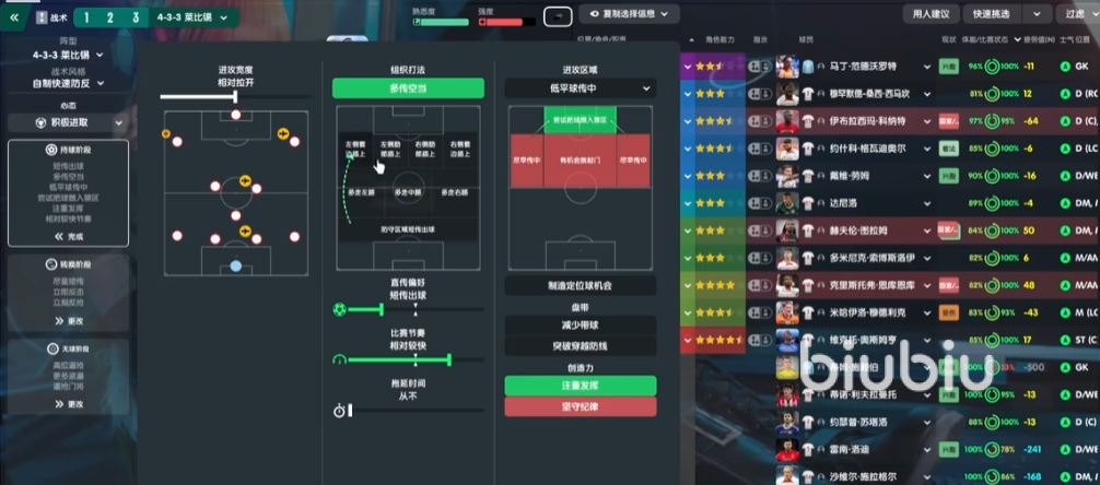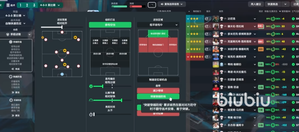 那么在组织打法中,还是会把多传空档点起来,主要给一个提前量的传球会更多一些,这个对于进攻的影响还是比较明显的,433也需要这样的多传空档。那么在肋部插上的这个地方,这套战术现在是全都不设置。因为对于一个球员来说,他的个人习惯和个人职责给他带来的套边影响,其实是比球队整体面板上给他带来影响是要大的。