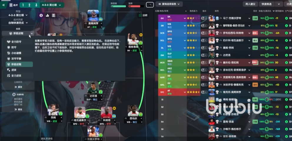 在足球经理2024游戏中,新人教练最推荐的阵型之一就是433。对于433的这套战术,给大家介绍一下球队的全队战术设置。第一个就是心态,一般球员都是积极进取去开球,如果是客场打强队或者是场面上已经领先两个以上,那么就降成攻守平衡。如果是打弱队或者是自己急需进球,就提升为进攻。