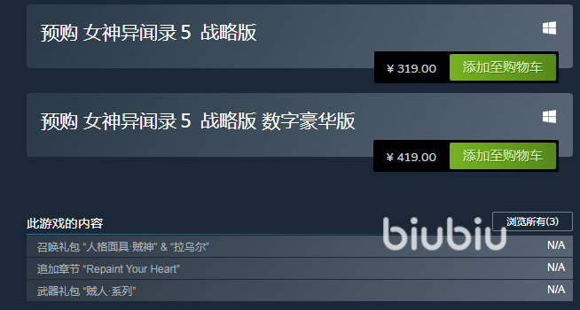 小编就以PC端为例,它在steam发售的版本共计有标准和豪华版两种,价格分别是319和419。因为游戏目前还没有上线,所以现在是有预购奖励的,便宜的可以获得两面具加游戏的本体,贵的则在前面的基础上增加了新章节内容以及武器礼包。