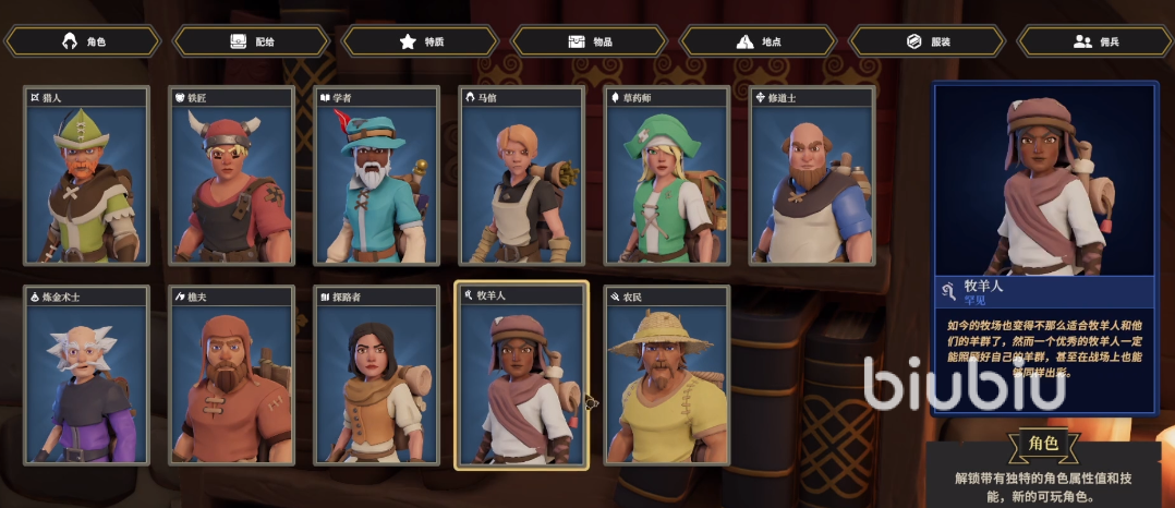 牧羊人的技能叫做无羁牧者,在回合结束时有几率获得一头追随者羊。草药师的技能是寻找草药和团队治疗,第一个就是有概率随机获得草药,第二个则是为队友提供治疗。可以看到有非常多的人物技能都是随机刷新物品的。