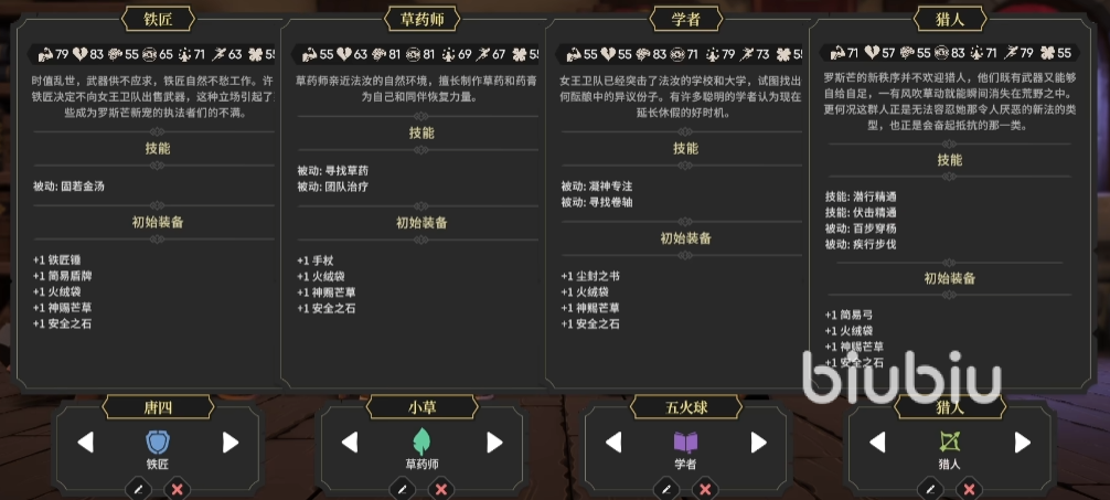 上面是整体打的流程,那这里小编也简单给大家介绍一下第一章的人员配置。再过第一章以及打boss的时候,我们主要是带一个铁匠,一个草药师,一个学者,一个猎手。铁匠就作为主T,就是带盾拿短兵器的那个角色,他本身也是坦克角色,然后就是草药师,因为他有一个团队回血的技能,但这个技能是是依托在给药草时才能团体回血。不过这个回血也很关键,所以你要一直给药草师累积药草。