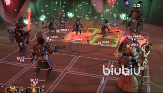 首先地精狙击手们会发起远程攻击,这里需要将农民和铁匠放在前排承受伤害,后面放猎人和学者作为主要输出。等小怪结束回合后,就会先到猎人回合,可以先使用一下隐士草提升闪避,然后使用普通攻击攻击后排的地精欺诈者。之后回到敌人的回合,等到学者回合时,我们先使用一个神赐芒草恢复一下血量,之后释放一个AOE技能混沌风暴,选中中间位置的敌人,可以对6个敌人造成30的伤害,并有几率造成中毒。之后结束战斗等到农民和铁匠的回合,可以先让农民使用巨力烈焰斩攻击沼泽痛饮者,然后让铁匠发动猛击。这里建议先将血量较低的小怪处理掉,让对方减员。