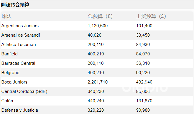 为了让大家更好的了解数据,下图当中就是整理出来的阿超联赛预算数值。阿根廷青年俱乐部转会预算是112万,工资在10万左右。萨兰迪阿森纳转会预算只有4万,工资在3.3万。马德里竞技转会预算20万,工资在8.5万。班菲尔德转会预算是40万,工资预算是8.4万。巴拉卡斯的转会预算是20万,工资在3.6万。贝尔格拉诺转会预算40万,工资预算9万。博卡青年转会预算220万,工资是43万的预算,非常高了。科尔多瓦转会预算34玩,工资预算8.5万。科隆转会预算44万,工资预算13万。国防与司法社会体育俱乐部转会预算32万,工资9万。
