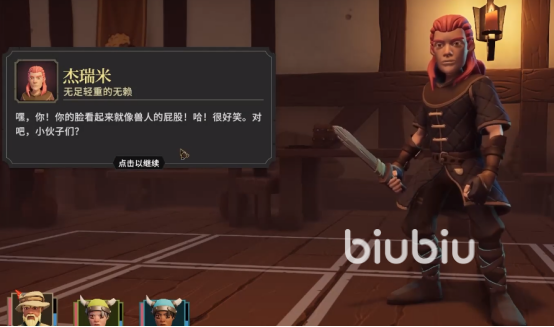 我们先将四个角色移动到酒馆旁,然后点击战斗,这场战斗需要将杰瑞米和醉海盗击败。我们有几率会获得他手上的杰瑞米之剑,是一件可以增加物理伤害,以及6%暴击率的宝物,适合前排的战士使用。